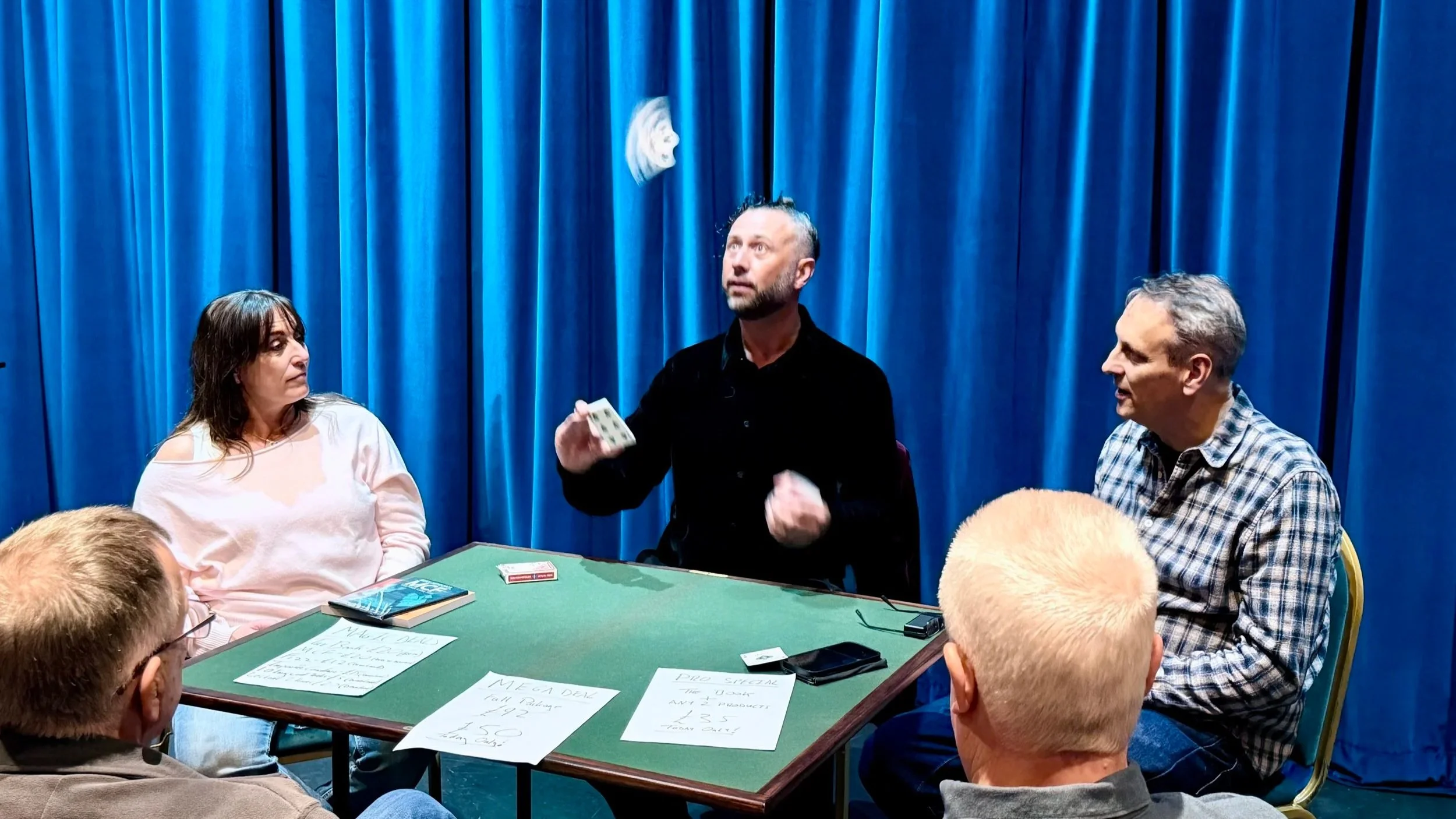 He opened with a routine involving more than ten spectators each selecting a card, which were then apparently lost back into the deck. What followed was a combination of control, memory, and showmanship - locating every card, revealing them in the exact order they were chosen, and doing so with a mix of flourish, humour, and the occasional moment of controlled chaos (cards flying included). It was one of those routines that reminds you how entertaining card magic can be when it’s performed at full pace.